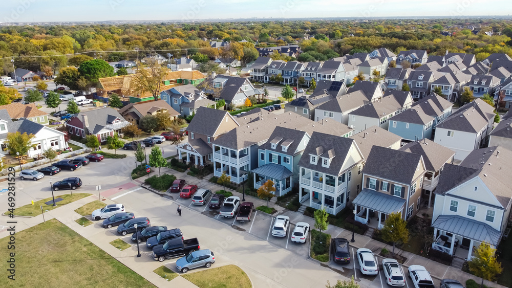 Aerial view upscale neighborhood with under construction wooden houses near Dallas, Texas, USA