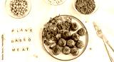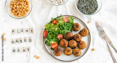 Top view Vegan veggie meatballs on the plate with fresh salad. Pea protein ingredients on the background. Plant based meat concept.Vegetarian lunch. Healthy eating. Go vegan. Wide banner.