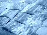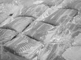 Frozen salmon fillet in plastic packing for sell in supermarket or seafood market.