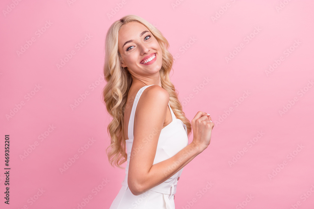 Profile side photo of young cheerful pretty girl happy positive smile wavy hair isolated over pastel color background