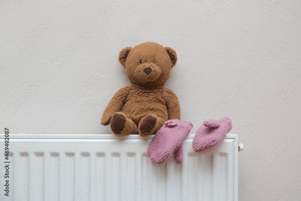 Photo of tedy bear and kid's woolen gloves drying on radiator. Winter season concept.