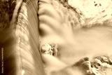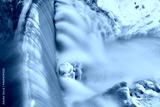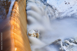 Water pours over the dam and icy rocks in the mouth of Vantaa River at the Vanhankaupunginkoski rapids (Vanhankaupunginkosken putous) extremely cold winter morning in March 2021.