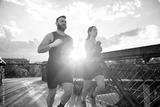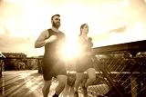 young Caucasian man and young Caucasian woman running on a bridge at sunset