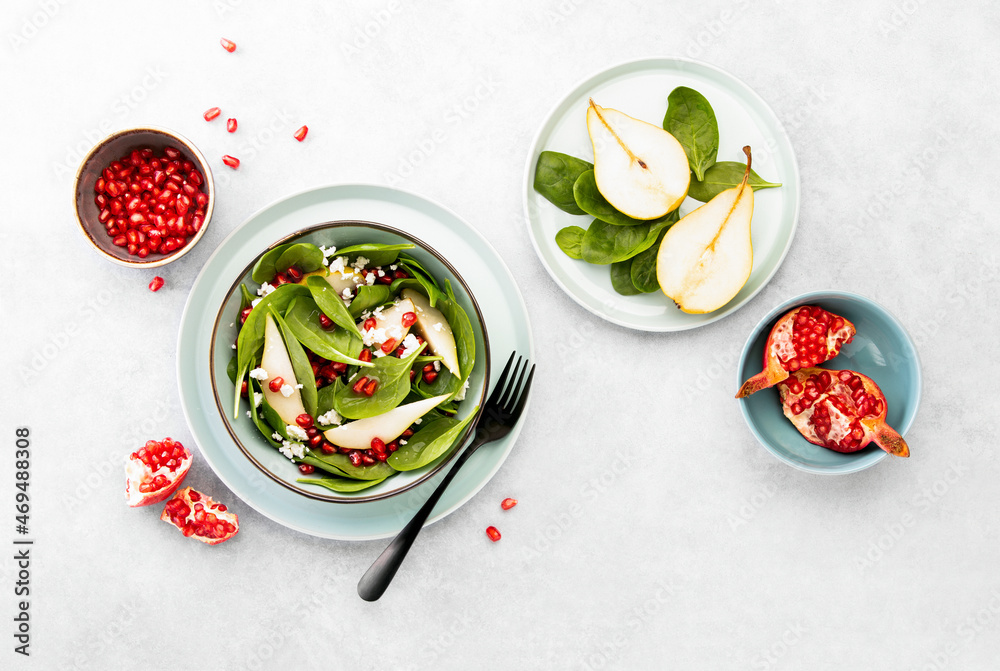 Spinach and pear salad with goat cheese and pomegranate seeds