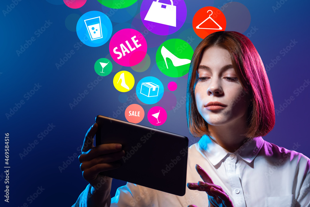 Woman with a tablet is engaged in online shopping. She buys goods online. Girl with many icons buys goods on tablet. Student is engaged in online shopping. Girl purchases goods through application