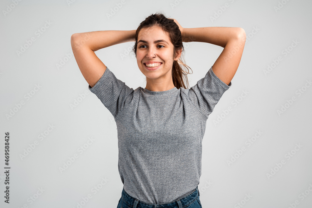 Waist up portrait of the overjoyed woman making ponytail with closed eyes isolated on a white background. People appearance concept