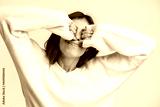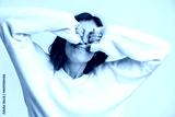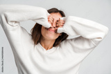 Portrait of beautiful young woman with brown hair standing and stretching with closed eyes and raised arms. Indoor studio shot isolated on white background