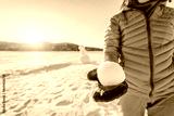 Winter outdoor active lifestyle concept. Girl holding snowball on snowy day with snowman in background on frozen lake at beautiful winter sunset