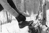 Winter running in snowing forest nature. Woman trail runner tying shoe laces in snow in winter forest landscape. Female cross country runner unrecognizable. Closeup of running shoes