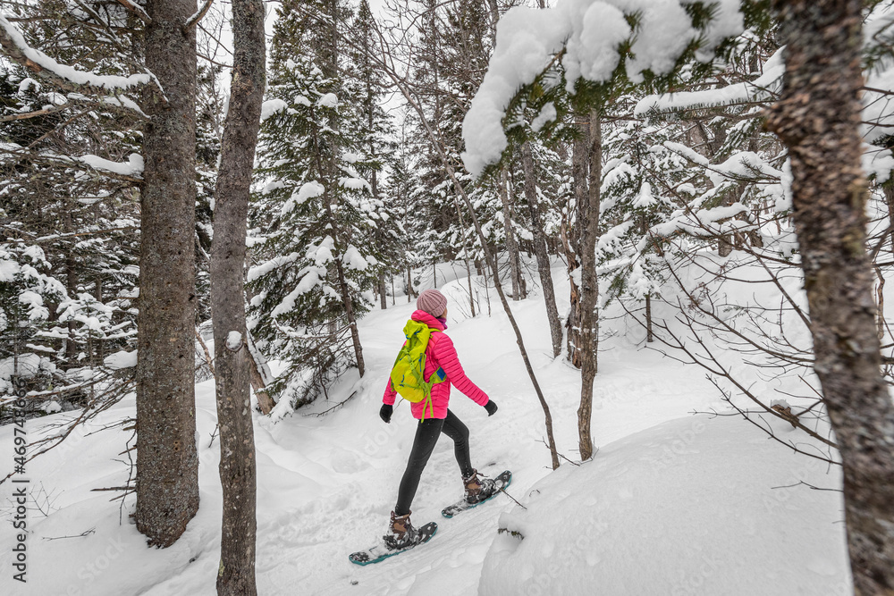 Snowshoeing people in winter forest with snow covered trees on snowy day. Woman on hike in snow hiking in snowshoes living healthy active outdoor lifestyle