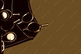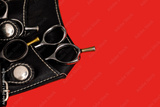 Hairdresser working tools, scissors, clip and organizer on a red background. Copy space