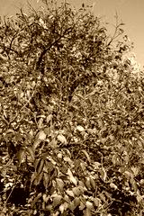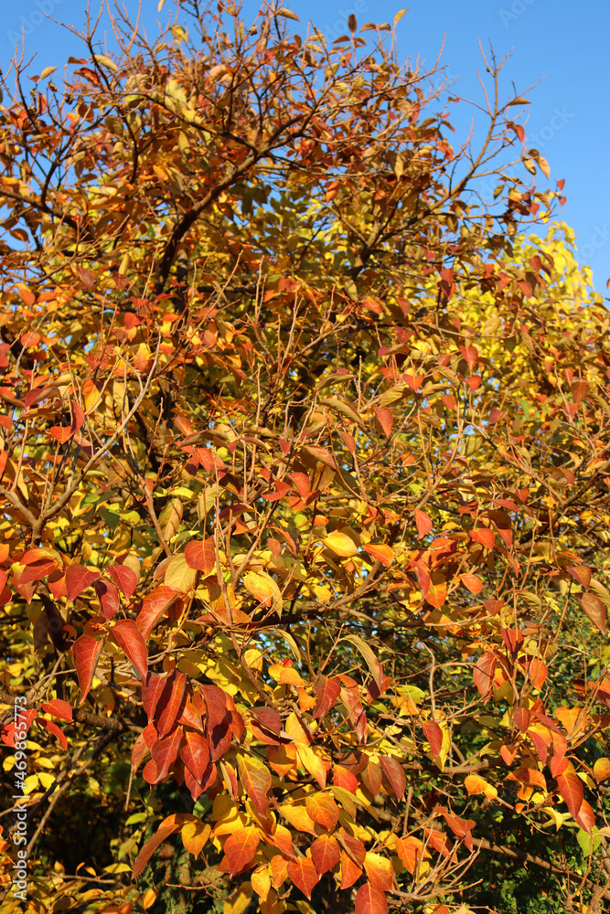 Persimmon tree on autumn season with yellow, red and brown leaves on branches. Diospyros kaki tree against blue sky