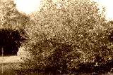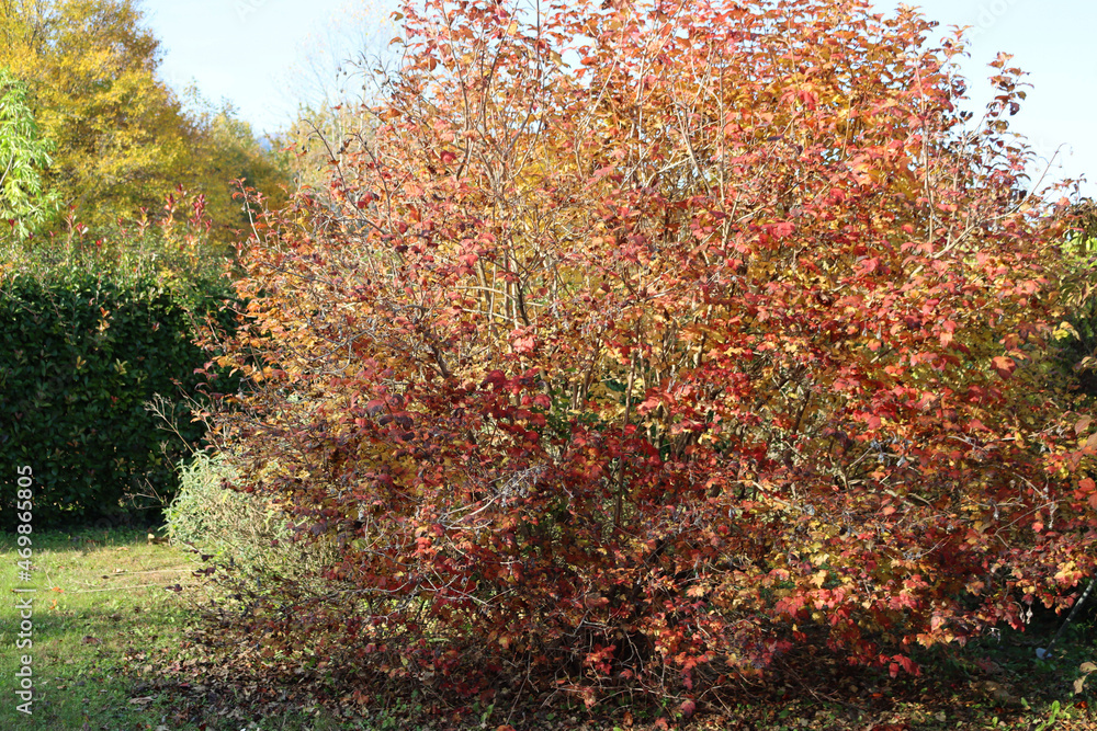 Viburnum opulus with many red and brown leaves in autumn season. Snowball bush in the garden