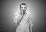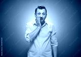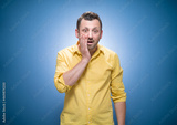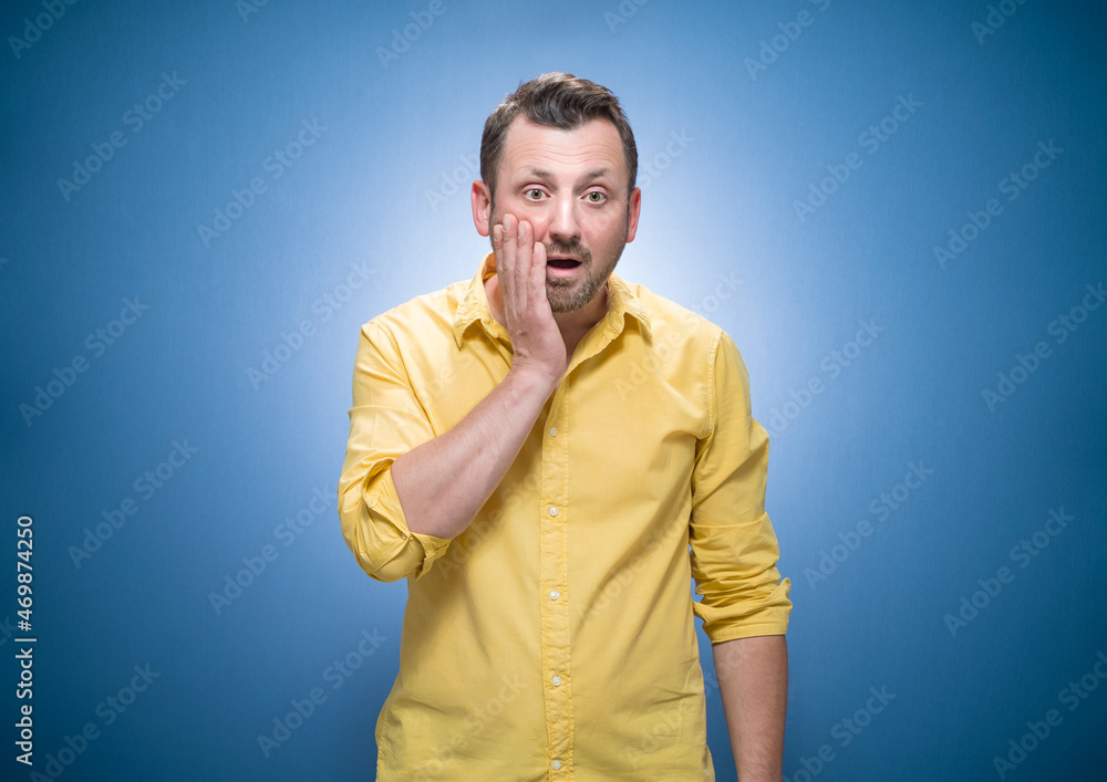 Oops. Ashamed young man with hand on cheek. Shame concept over blue background, dresses in yellow shirt