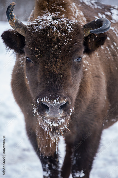European bison (Bison bonasus) in the Skole Beskydy national park in winter, Carpathians, Ukraine snow