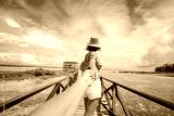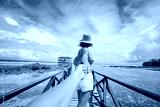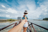 Follow me. Travel concept. Vacation on tropical island. Back view young woman in hat holding boyfriend's hand enjoying sea view from wooden bridge terrace, Cloud 9 Surfing Spot, Siargao Philippines.