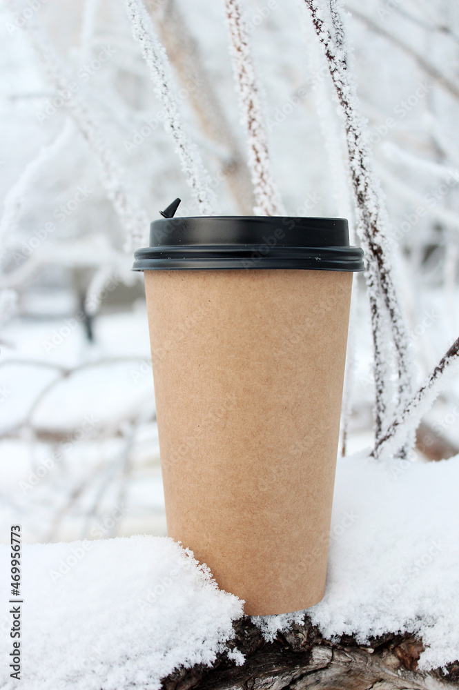 Takeaway coffee glass. Cup of coffee with place for text. Glass for coffee on a winter background.