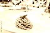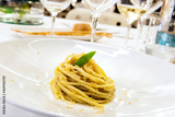 Plate of spaghetti with chopped pistachio and toasted bread crumbs in restaurant