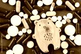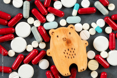Wooden bear cub on background of many pills, pills and vitamins. Children's medicine, treatment of children concept