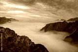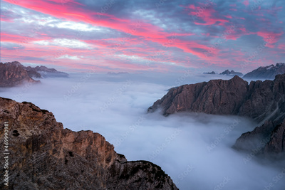 Dramatic sunrise landscape with flowing fog and pink skies in the Dolomites mountains. Location Auronzo rifugio in Tre Cime di Lavaredo National Park, Dolomites, Trentino Alto Adige, Italy