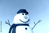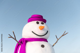 Funny snowman in stylish brown hat and pink scalf on snowy field. Blue sky on background