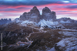 Dramatic evening landscape with Three peaks of Lavaredo mountains, glowing road and pink sunset sky. Auronzo refugio at Tre Cime Di Lavaredo National Park, Dolomite Alps, Trentino Alto adige, Italy