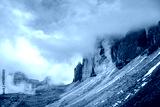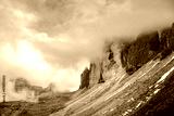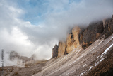 Incredible view of the Three Peaks of Lavaredo in morning fog. National Park Tre Cime di Lavaredo, Dolomite Alps mountains, Trentino Alto Adige region, Sudtirol, Dolomites, Italy
