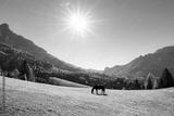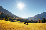 Alone horse on autumn meadow in the Dolomite Alps. Italian rural landscape with horse, sun in blue sky and peaks of high mountains in the background. Nigerpass (Passo Nigra), Dolomites, Italy
