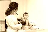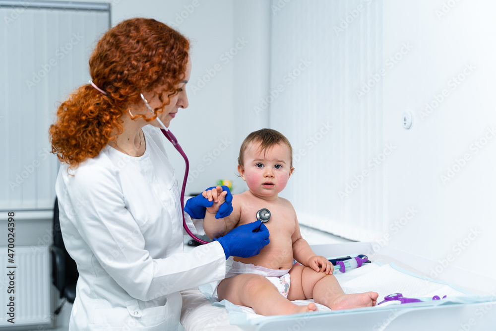 Pediatrician doctor concept. Children medical care. One year old baby girl examined by female pediatrician in clinic office. Child visiting doctor for health check-up. Doctor examine little patient