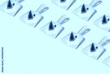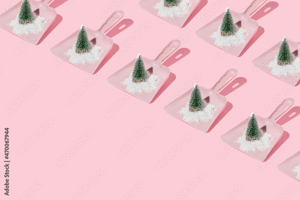 Christmas trees and snow in dustpans pattern on pastel pink background. Winter creative idea. Retro aesthetic christmas minimal concept.