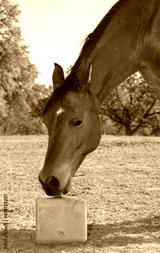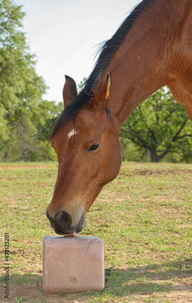 Bay horse licking a trace mineral block to replenish him with salt and other nutrients; in a green summer pasture