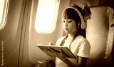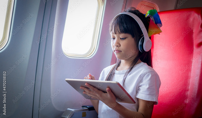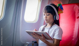 Young tourist girl passenger flight seat near window using smartphone app relax litsening music bluetooth headphones noise-cancelling using wifi internet connection on board