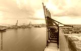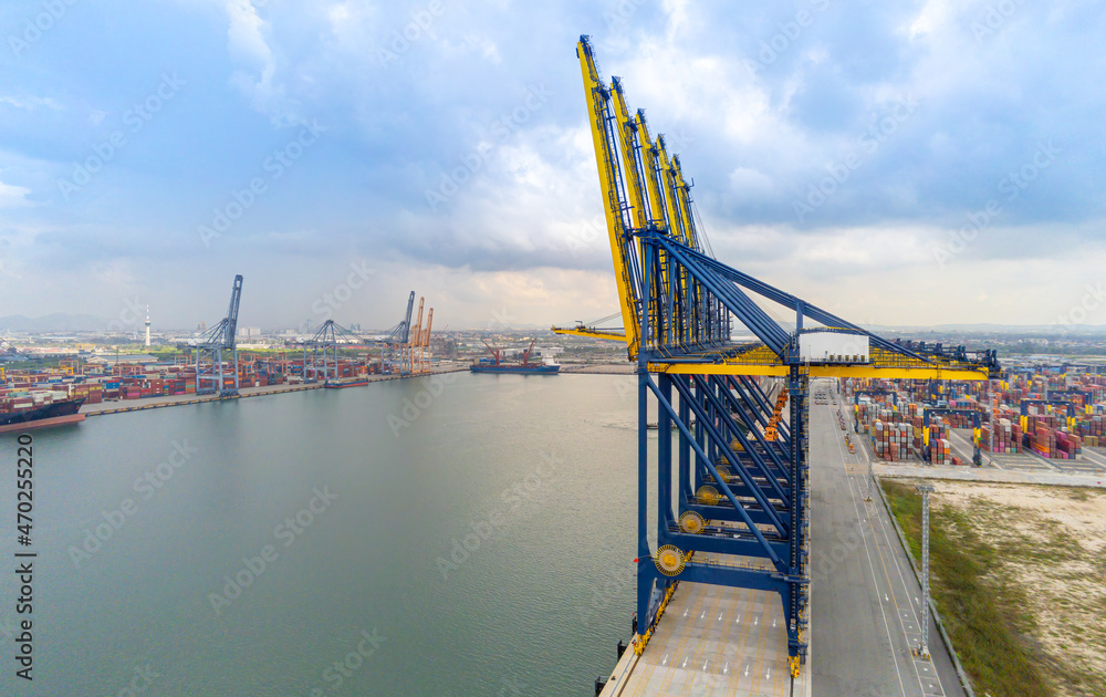 Container crane cargo freight ship with working crane loading bridge containers in shipyard at dock yard for logistic import and export transportation background.