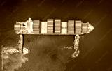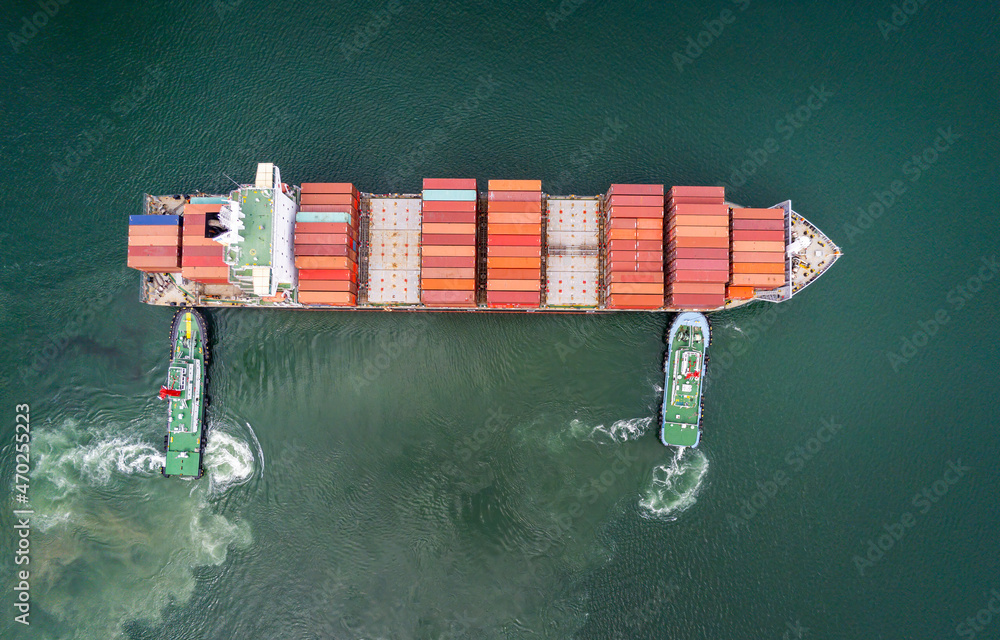 Aerial top view containers ship cargo business commercial trade logistic and transportation of international import export by container frieght cargo ship in the open seaport.