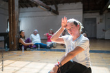 Hilarious senior dancer striking pose in studio. Slim female retiree with fair hair posing after dance class. Dance, hobby, healthy lifestyle concept