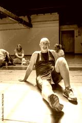 Calm looking senior Caucasian male dancer taking rest. Old male dancer in glasses resting on floor after class. Dance, hobby, healthy lifestyle concept