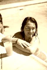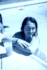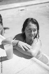 Charming young woman swimming in pool. Portrait of good-looking woman resting at the edge of a swimming pool. Leisure, party concept