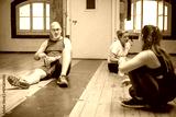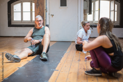 Tired senior dance group taking break. Adults resting after dance class drinking water and talking. Dance, hobby, healthy lifestyle concept