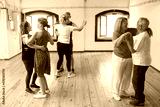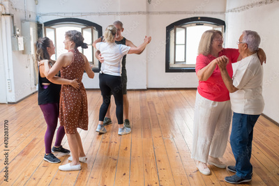 Senior Caucasian dancers smiling and and dancing in pairs. Happy retired couples learning couple dance moves in studio. Dance, hobby, healthy lifestyle concept