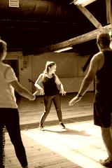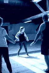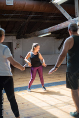 Sporty woman showing dance moves looking away. Female dance teacher giving dance class to seniors in studio. Dance, hobby, healthy lifestyle concept