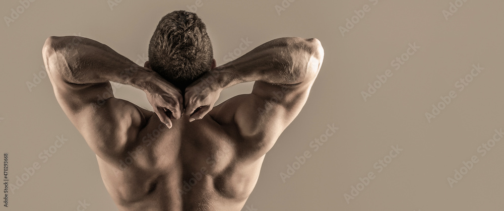Muscular back, muscular man, muscled back, naked torso. Male naked, healthy musculars guy, torso man, isolated. Man with muscular arms, triceps. Waist, waistline. Guy with beautiful torso