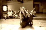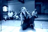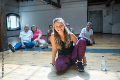 Smiling young dance teacher sitting on floor. Cheerful female Caucasian dance instructor with fair hair after class with her group. Dance, hobby, healthy lifestyle concept
