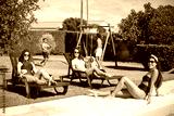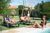 Peaceful female friends sunbathing near swimming pool. Slim women in swimsuits lying on deck chairs, talking, looking at camera. Men playing ball in background. Leisure, friendship, party concept