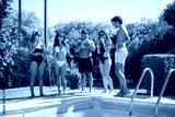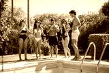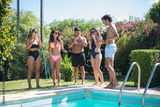 Content young friends having fun near swimming pool. Men and women in swimsuits talking, drinking cocktails. Leisure, friendship, party concept
