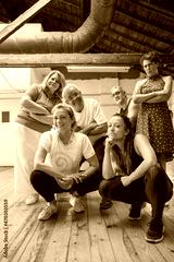 Hilarious senior dance group making faces with arms crossed. Funny retirees having fun after dance class with teacher posing for camera with their instructor. Dance, hobby, healthy lifestyle concept