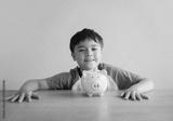 Happy boy sitting with piggy bank on table on white background, child with smiling face showing money saving box.kid Learning financial responsibility and planning about saving money for future