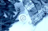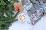 coffee cup with marshmallows, gift box, candy cane, sweater, fir tree branches on marble background. New year and Christmas holidays concept. festive winter season. flat lay