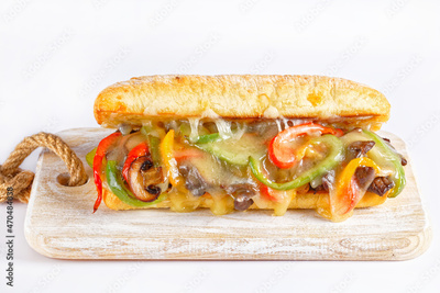 philly steak sandwich with melted cheese, top view