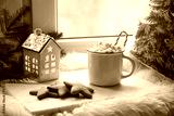 Winter coffee with marshmallow on windowsill with pillow and fur skin decorated fir branches and little toy house. Xmas. Christmas mood.