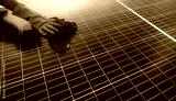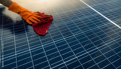 Man cleaning solar panel on roof. Solar panel or photovoltaic module maintenance. Sustainable resource and renewable energy for go green concept. Solar power for green energy. Technology for future.